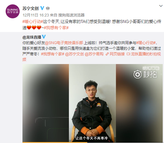 而且,来自SNG电子竞技俱乐部的多位成员也以“我想有个家”为口号,在视频中邀请粉丝加入暖心行动,用快递盒为它们打造一个温暖的小窝,帮助他们渡过严严寒冬!