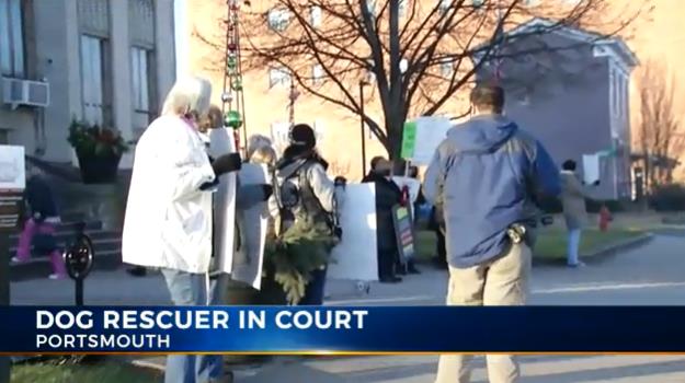 十几名支持者出现在朴茨茅斯市法院大门附近,举牌抗议罗斯被指控。他们喊着口号,“应该指控虐狗人,而不是救狗人!”