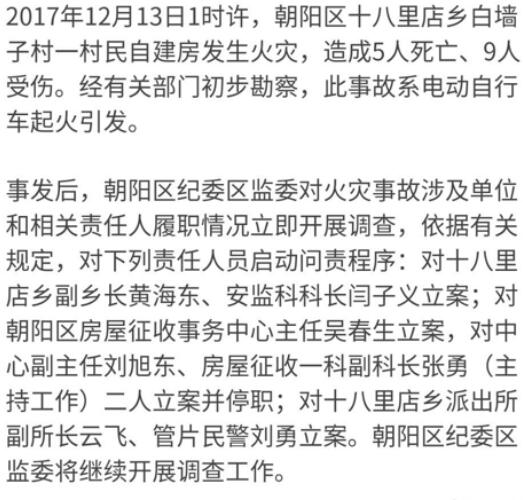 原标题:北京朝阳十八里店火灾致5人死亡:房东被刑拘 副乡长等7人被立案 未来网(www.k618