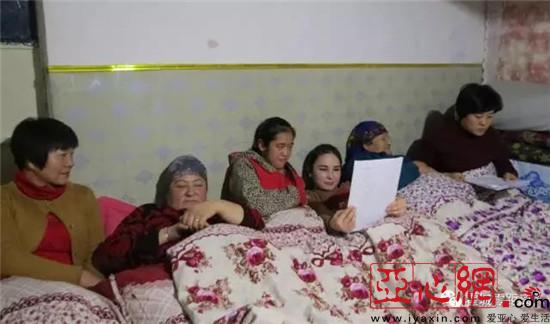 大家伙与结对亲戚家96岁高龄的老奶奶挤在土炕上学习十九大精神,讲身边民族团结的故事