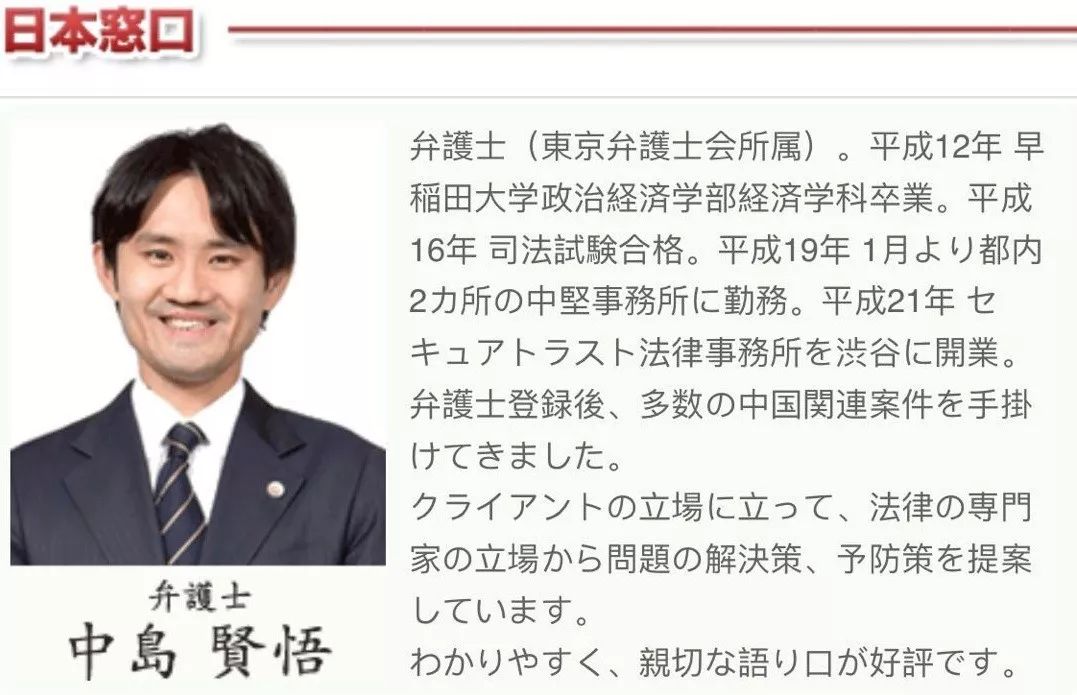 据中岛贤悟所在公司网站的信息,中岛2000年毕业于早稻田大学政治经济学科,4年后通过日本司法考试。2007年1月后,中岛在东京都两所知名事务所工作过。在获得律师资格证后,中岛代理过很多与中国相关的案件。