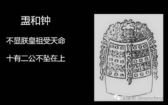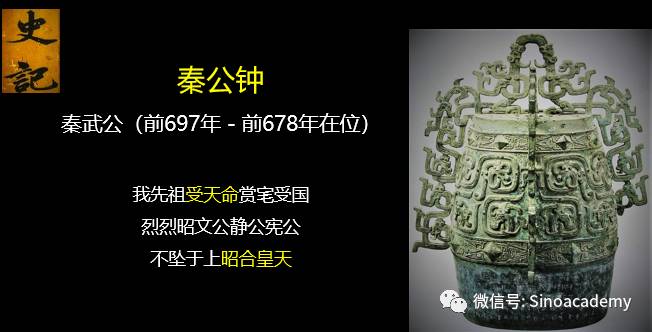 第三件是在1978年发现的秦公钟,这是秦武公时期的作品。铭文中说:“我先祖受天命赏宒受国,烈烈昭文公、静公、宪公,不坠于上,昭合皇天”,这三个先公之灵,都在天界上,和皇天上帝在一起。