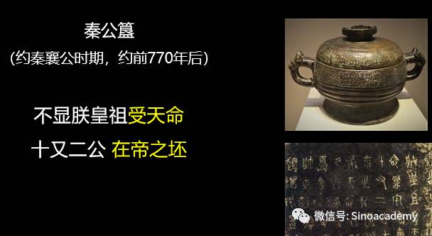 第一件是秦公簋。 1919年出土于甘肃,现存中国历史博物馆。秦公簋是春秋早期时秦国的青铜器。但是作器者是哪一位秦国国君,学者有不同的看法。我认同是秦襄公的观点。秦公簋铭文中写到:“不显朕皇祖受天命,十又二公,在帝之坯”,“坯”原义是围墙,意思就是秦国十二位先公之灵环绕在上帝身边。强调秦人要敬奉天命,要占有四方。这里面出现的“受天命”、“在帝之坯”,跟周王室唱颂的周文王承受天命、在上帝周边的内容一致。