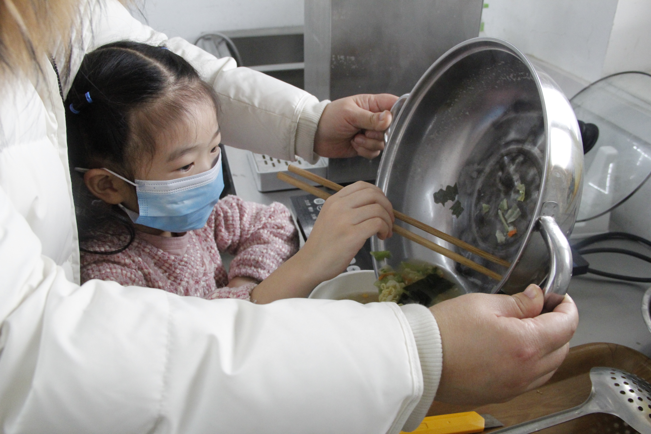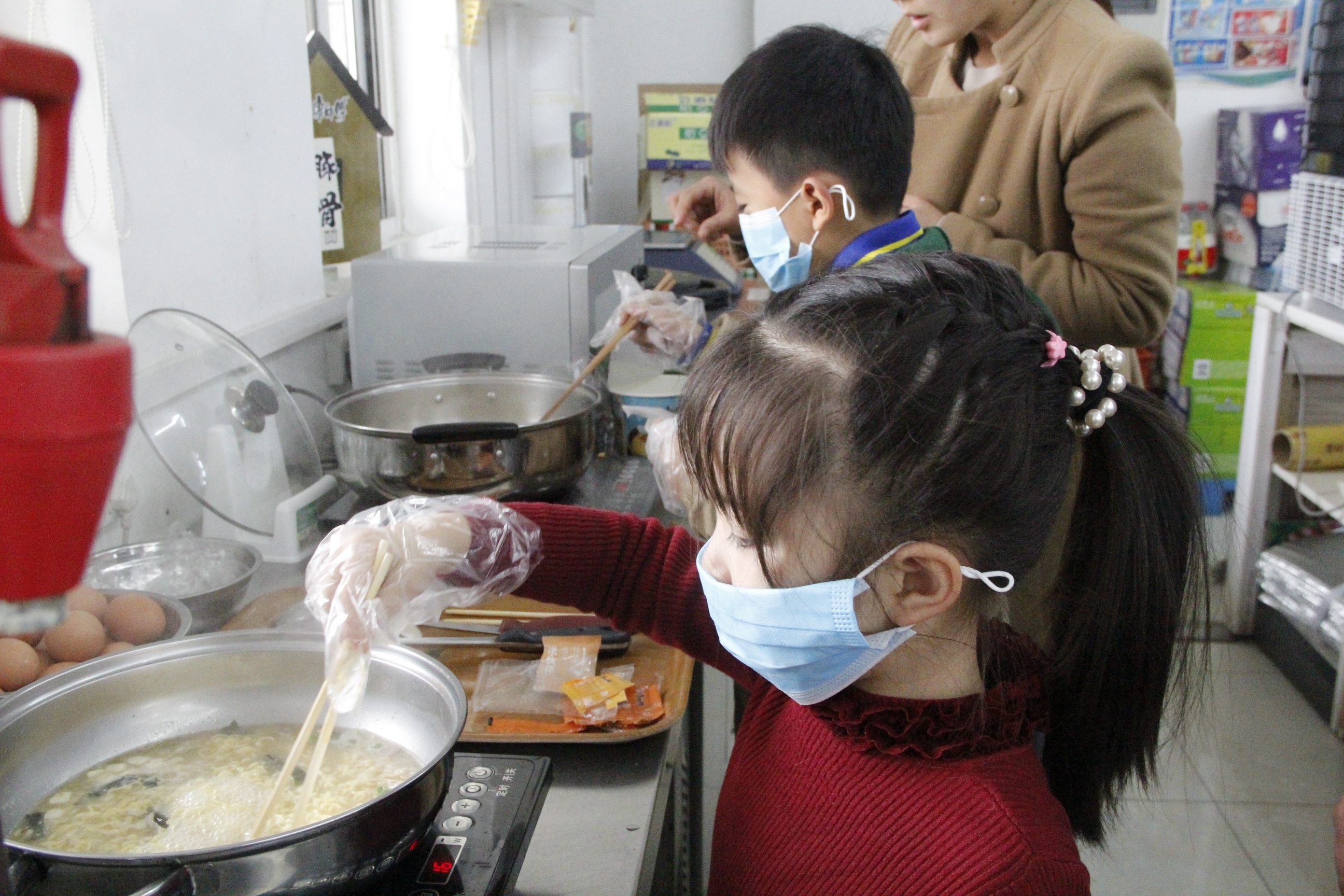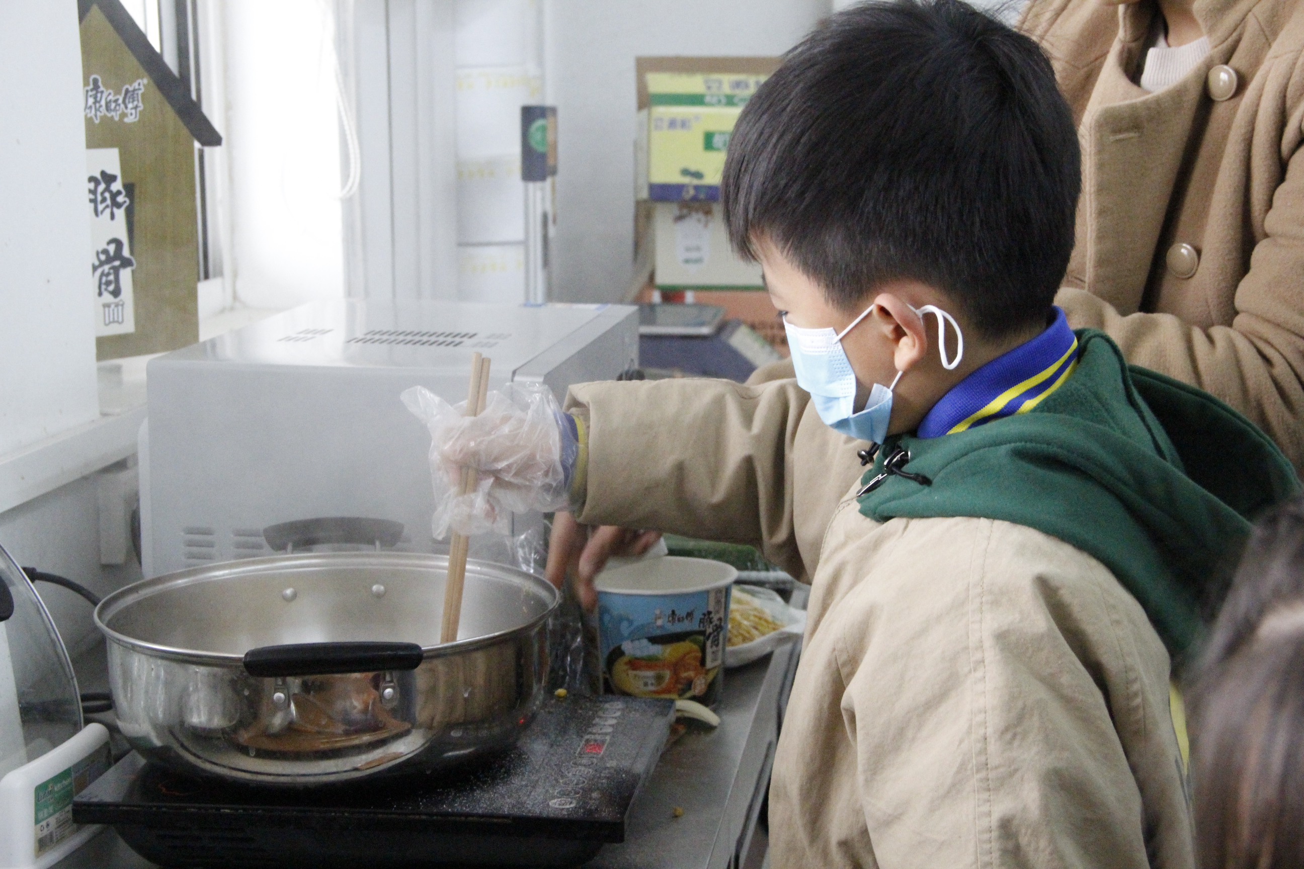外面瑟瑟冬风,而现场却被小记者们的热情包裹着。拆包、煮面、放料,一步一步很是专业~
