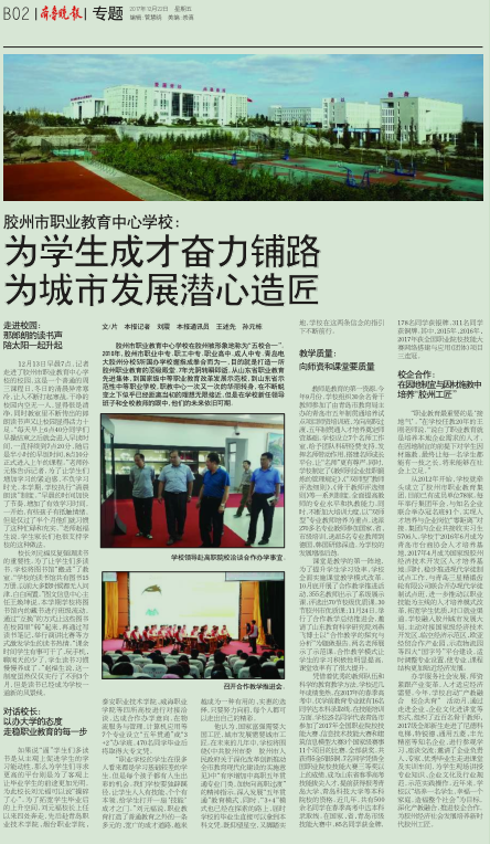 他认为,国家富强需要大国工匠,城市发展需要城市工匠。在未来的几年中,学校将围绕《中共胶州市委 胶州市人民政府关于深化改革创新推动全市教育现代化建设的实施意见》中“有序增加中高职五年贯通专业门类,加快向高职过渡”的精神指示,深入发展“五年贯通”教育模式,同时,“3+4”模式也已经在探索的路上,届时职教中心的毕业生直接可以拿到本科文凭。既仰望星空,又脚踏实地,职教中心在这两条信念的指引下不断前行。