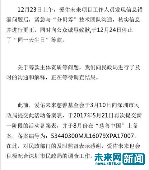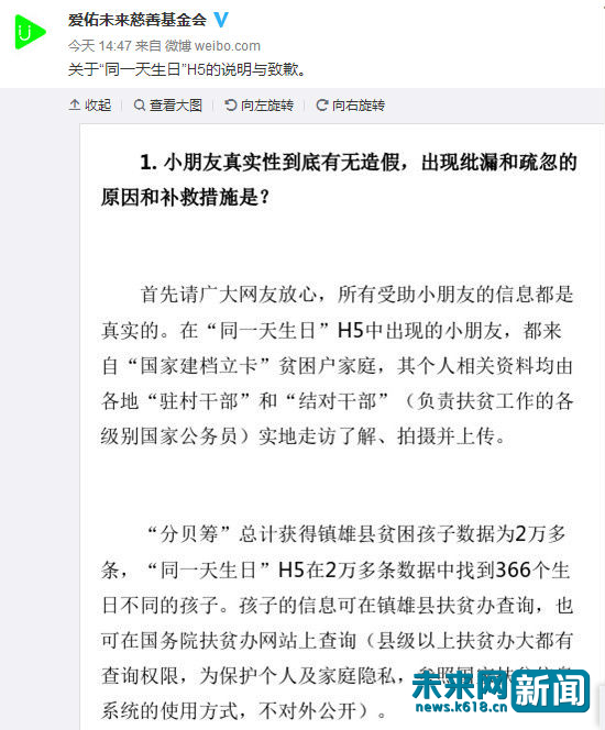 原标题:爱佑未来基金会致歉:"同一天生日"是低级错误 孩子情况属实 未来网(www.k618.c