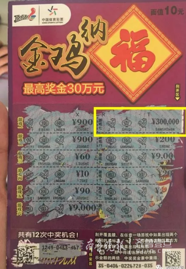 顶呱刮“金鸡纳福”是一款贺岁票,以寓意吉祥如意的锦鸡为主题,绚丽的色彩中透露出浓浓的中国风。单张面值10元,有12次中奖机会,最高奖金30万元,如果在任意一场游戏中如果出现两个相同的“鸡”标志,即中得该场游戏右方所示的金额。这位泰安小伙就是在“游戏七”中刮出了两个鸡标志,中得后方所示金额为¥300000。