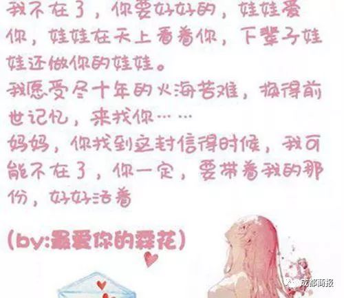 懂事的小霖花写道:“你告诉我,我就是你的命,我死了,你就不在了。(所以)我为了你,都要活下去,为了你,我都要多吃、多喝。我不能哭,我一哭你就不高兴了,所以我每天都要开开心心地过……我不允许你来地狱陪我受苦,自杀者可是进不了天堂的哦!