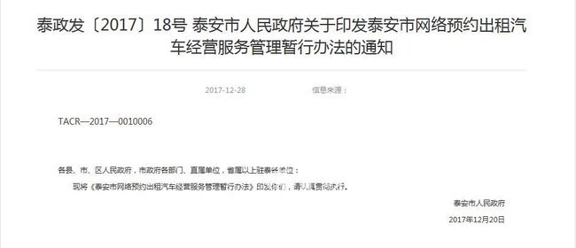 28日,泰安市政府官方网站公布《泰安市人民政府关于印发泰安市网络预约出租汽车经营服务管理暂行办法的通知》,公开《泰安市网络预约出租汽车经营服务管理暂行办法》(以下简称《办法》),实施办法自 2018 年 2 月 1 日起施行,有效期至2020年1月31日。