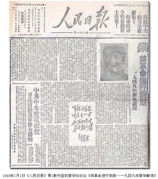 1949年1月1日,毛泽东在《人民日报》头版发布了新年献词——《将革命进行到底》,隔空喊话,用一篇激情饱满、有理有据的献词回击蒋介石的阴谋。