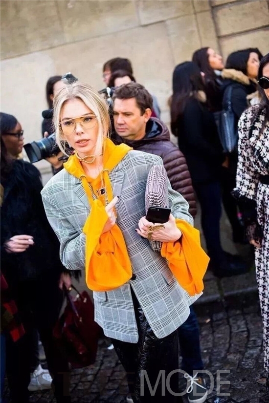 大热的格纹西装搭配一款靓丽的卫衣,还有谁能说你不够时髦呢!同样是西装外套,经典的纯色款内搭卫衣也是非常洋气,正式中不乏休闲的意味,搭配裤装可上班穿,搭配裙子作约会装,看起来如沐春风的感觉。