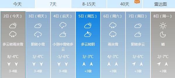 4~5日(周四~周五),全省天气阴, 鲁南地区有中到大雪局部暴雪,鲁西北的西部和鲁中地区有小到中雪局部大雪,其他地区有小雪 。 北风,渤海、渤海海峡、黄海北部和中部北风5~6级;半岛地区4~5级减弱到3~4级,其他内陆地区3~4级减弱到2~3级。