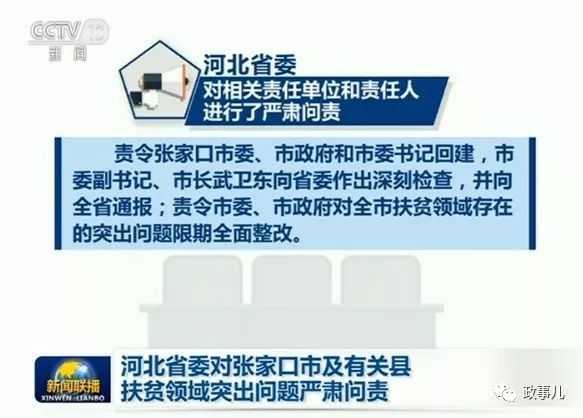 根据《中国共产党问责条例》《中国共产党纪律处分条例》等有关规定,河北省委责令张家口市委、市政府和市委书记回建,市委副书记、市长武卫东向省委作出深刻检查,并向全省通报;责令市委、市政府对全市扶贫领域存在的突出问题限期全面整改。