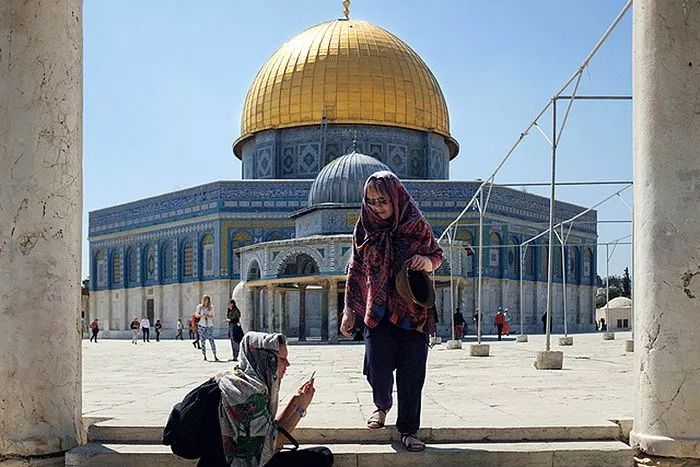 而哭墙一旁便是伊斯兰教圣地,圆顶清真寺,金灿灿的穹顶已成为耶路撒冷城市地标,非常好认。