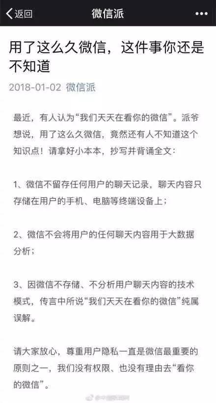 微信就此很快发表声明,承诺不留存聊天记录、不将聊天记录用于大数据分析。