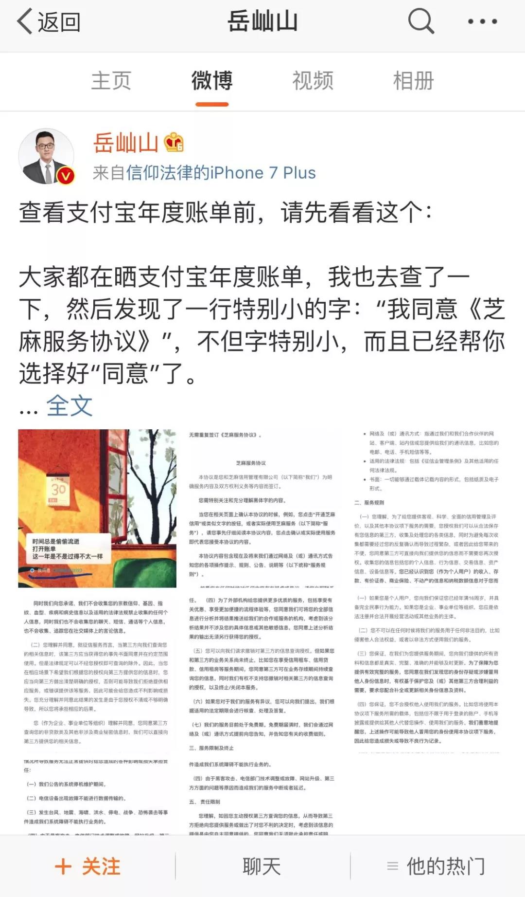 不过,玩笑归玩笑,在大家都在欢快刷屏的时候,一名叫岳屾山的律师曝出了支付宝账单背后的秘密——在查阅年度账单的时候,支付宝默认勾选“我同意《芝麻服务协议》”,但是字体非常小,用户很难留意到。而同意这个《芝麻服务协议》则会允许支付宝收集你的信息包括在第三方保存的信息,更重要的是,根据《协议》,芝麻信用可以直接向第三方提供用户信息,且用户无权撤销第三方的信息查询授权。