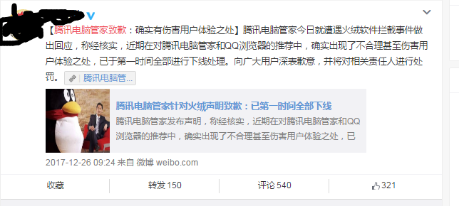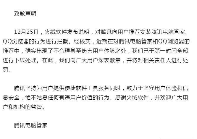 针对火绒公告中披露的侵害用户权益的行为,腾讯电脑管家在微博发出道歉声明:确实出现了不合理甚至伤害用户体验之处,我们已于第一时间全部进行下线处理。