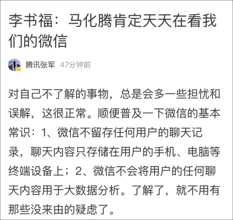 正式有了这样的前车之鉴,所以,前几天,吉利董事长李书福在参加一个论坛的时候谈到信息安全时就表示“马化腾肯定天天在看我们的微信,因为他都可以看的,随便看,这些问题非常大”。