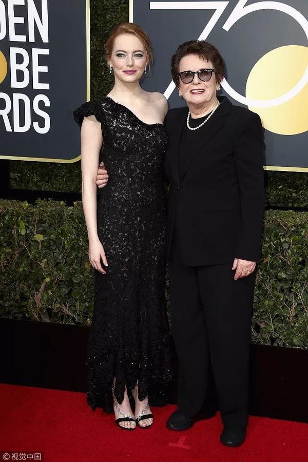 去年奥斯卡和金球的双料影后“石头姐”,在《性别大战》里“改头换面”地饰演了倡导男女平权的网球女将Billie Jean King,站在她身边的就是 Billie本尊了 。