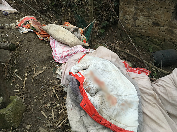 丢弃在房屋外的衣服和被子,上面的血迹十分明显。澎湃新闻记者王鑫摄