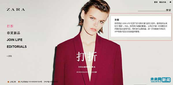 服装企业ZARA也于1月12日晚间在其官网表示:“我司网站“JOIN LIFE”栏目下的“收取衣服”选项介绍中,错误地将台湾称为“国家”。对此,我司表示诚挚的歉意。公司已于第一时间更改该页面的违法违规内容,同时进行全面自查,进一步加强官方网站及APP信息内容合法性审查和管理。”