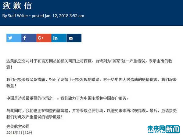 1月12日,达美航空公司的简体中文网站发布致歉信称,对于在官方网站的相关网页上将西藏、台湾列为“国家”这一严重错误,表示由衷的歉意!