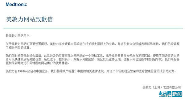 美敦力也于1月12日晚在官网发布致歉信称:关于美敦力网站的页面设置问题,美敦力完全理解中国政府在相关领土问题上的立场,并对引起公众误解表示诚恳道歉。我们已经调整了相关网页的设置。