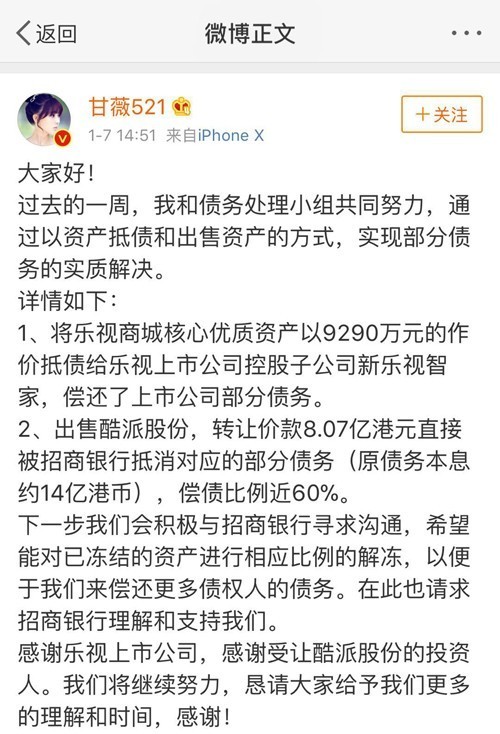 1月4日,甘薇也曾在微博中提到出售酷派股份,所得价款被招商银行抵消对应的部分债务(原债务本息约14亿港币),偿债比例近60%。据澎湃新闻报道,这笔还款将采取分批的方式逐步归还到招行。