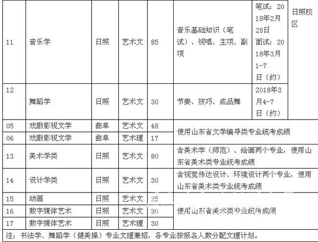 2018年曲师大在省内招收的艺术类专业有书法学、舞蹈学(健美操)、音乐表演、音乐学、舞蹈学、戏剧影视文学、美术学类、设计学类、动画、数字媒体艺术等。其中,书法学、舞蹈学(健美操)、戏剧影视文学、数字媒体艺术专业文理兼收。戏剧影视文学专业使用山东省文学编导类专业统考成绩,按投档考生综合分确定录取专业;综合分相同时,按高考文化成绩(含加分)确定录取专业。美术学类、设计学类、动画、数字媒体艺术专业使用山东省美术类专业统考成绩,按投档考生综合分确定录取专业;综合分相同时,按专业成绩确定录取专业。
