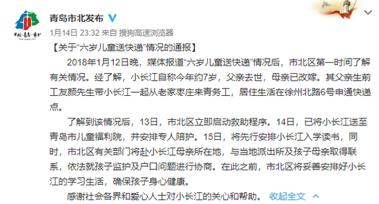 青岛市市北区人民政府新闻办公室官方微博 @青岛市北发布消息,2018年1月12日晚,媒体报道“六岁儿童送快递”情况后,市北区第一时间了解有关情况。经了解,小长江自称今年约7岁,父亲去世,母亲已改嫁。其父亲生前工友颜先生带小长江一起从老家枣庄来青务工,居住生活在徐州北路6号申通快递点。