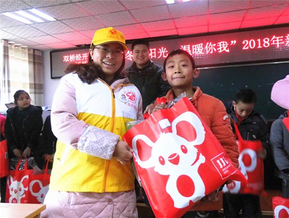 志愿者们先后来到了经开小学、苗苗幼儿园、晨曦幼儿园和通桥小学,为60余名孩子们送去了书包、棉衣、运动鞋等心愿礼物。据悉,活动前由各学校的少先队辅导员广泛地征集了孩子们的新年愿望,志愿者再有针对性地为孩子们购置了暖冬礼物。