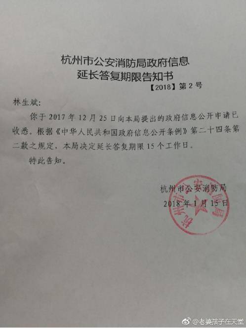12月25日,杭州保姆纵火案受害者家属林生斌通过其微博发出《信息公开申请书》,向杭州市公安消防局申请公布火灾调查报告和其他相关信息,杭州市公安消防局回应将在规定期限内回复。1月16日,林生斌通过微博发出消息,杭州市公安消防局在15日回复称,将延长答复期限15个工作日。