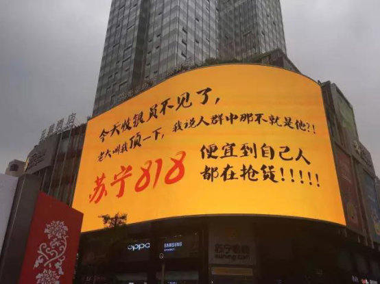 2017年“818”期间,苏宁大胆在线下铺设如此充满互联网元素的个性广告。很快,广告前就站满了路人,并拿出手机合影发朋友圈。