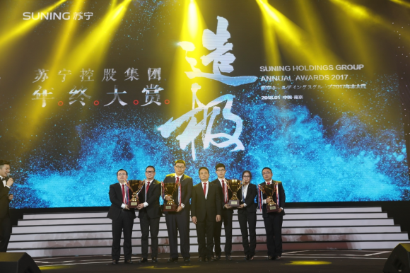 (图:1月16日,苏宁控股集团举行“年终大赏”,“老大叫我顶一下”团队获得突出贡献奖。)