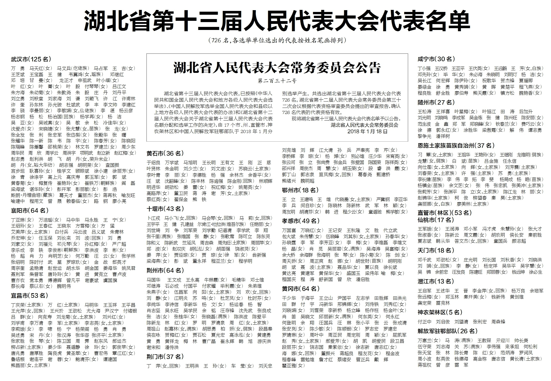 湖北日报讯 湖北省第十三届人民代表大会代表,已按照《中华人民共和国全国人民代表大会和地方各级人民代表大会选举法》、《中国人民解放军选举全国人民代表大会和县级以上地方各级人民代表大会代表的办法》和《湖北省第十二届人民代表大会关于湖北省第十三届人民代表大会代表名额分配和选举工作的决定》,由17个市、州、直管市、神农架林区和中国人民解放军驻鄂部队于2018年1月分别选举产生,共选出湖北省第十三届人民代表大会代表726名。湖北省第十二届人民代表大会常务委员会第三十二次会议根据代表资格审查委员会提出的审查报告,确认726名代表的代表资格有效。