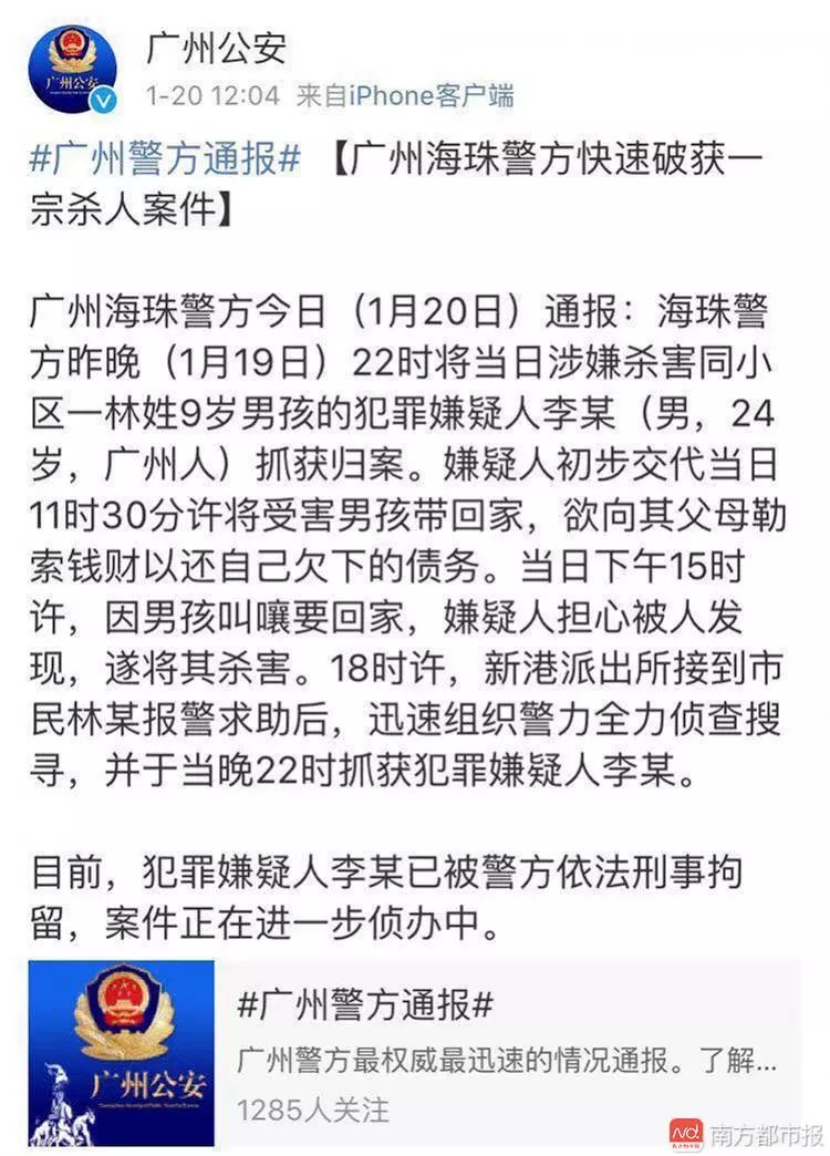 原标题:快讯!广州9岁男孩被邻居绑架杀害,凶手落网广州海珠警方今日(1月20日)通报:海珠警方昨晚(1月19日)22时将当日涉嫌杀害同小区一林姓9岁男孩的犯罪嫌疑人李某(男,24岁,广州人)抓获归案。