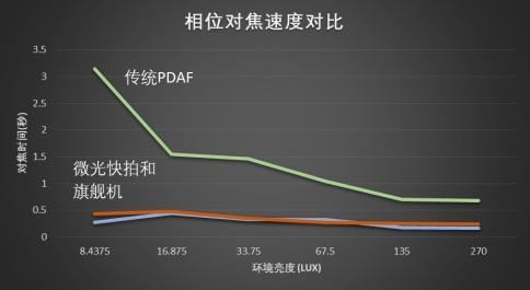 “微光快拍”与其他机型在不同光照强度下的相位对焦速度对比