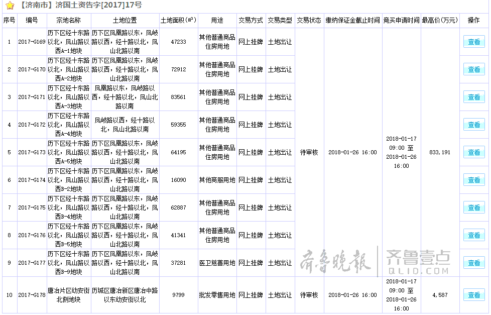 1月29日上午九点半,济南市国土资源局挂牌出让的10宗土地挂牌截止,进入竞买环节。其中,位于历下区经十东路以北,凤山路以西的刘智远片区有9宗土地进行竞买,包括7宗住宅用地、1宗商业商务用地和1宗医卫慈善用地,共计728亩。最终,这9宗土地以底价833191万元成交。网传摘牌人为银丰地产。根据成交价,居住用地最高楼面价格7312元/平米。