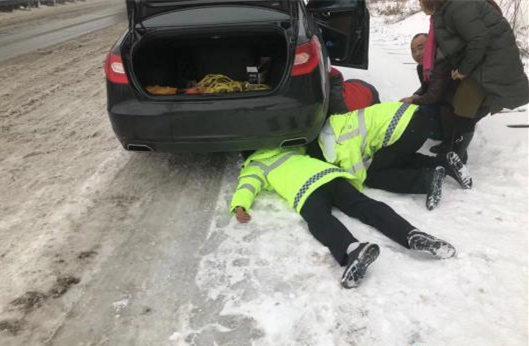 “全身趴在雪地里确实非常冷,好在衣服穿得厚实,当时就想赶紧给车主排除故障,没有顾忌太多。”曹兴磊表示,自己和同事们花了半个多小时将防滑链重新安装好。