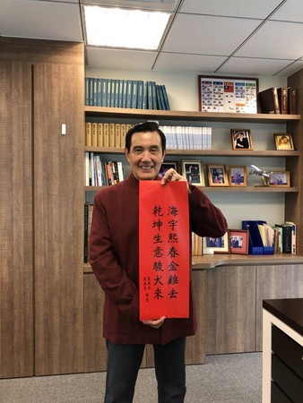 30日,马英九公布狗年的正式春联,“海宇熙春金鸡去,乾坤生意骏犬来”,向众人祝福狗年旺旺,财源滚滚,台湾风调雨顺,字迹也再度获得网友好评。