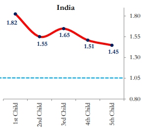 世界卫生组织提供的标准是,正常的出生人口性别比应为1.05,即有105个男孩出生的同时也应该有100个女孩出生。对于拥有多个孩子的印度家庭来说,头胎的性别比为1.07,十分接近正常水平。但如果是独生子女家庭(头胎即为最小的孩子),这些孩子的性别比高达1.82。换句话说,头胎为女儿的家庭选择继续生育的可能性要比头胎为儿子的家庭高出数倍。