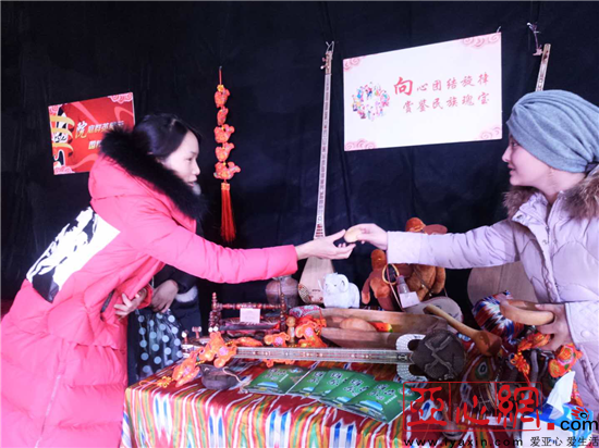 民族乐器、物品展台,社区书记与亲戚共同交流,互学文化。