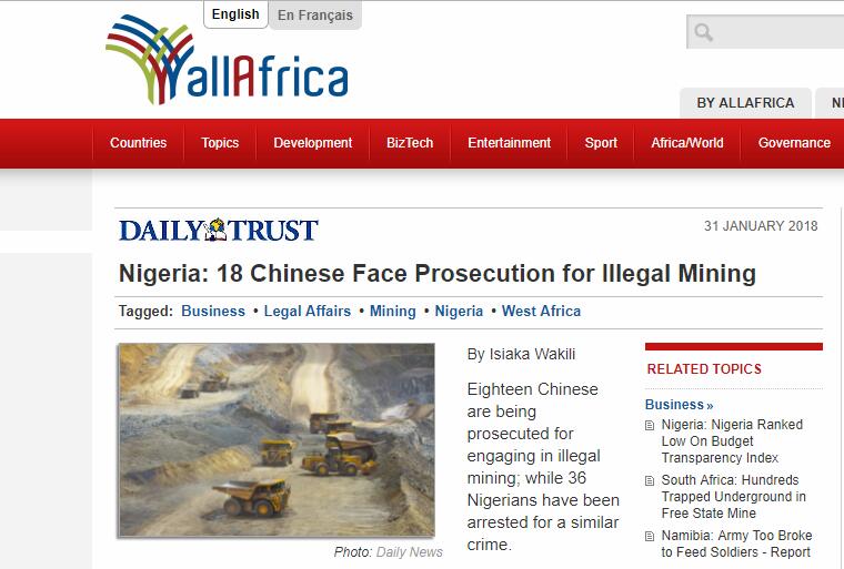 【环球网报道记者朱梦颖】据尼日利亚《卫报》1日报道,18名中国人近日在尼日利亚涉嫌从事非法采矿被捕。
