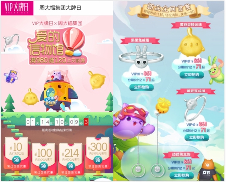 作为中国内地及香港著名珠宝首饰品牌,周大福于1929年在广州市创立,始终以真诚·永恒的专业态度,引领珠宝行业80余年。该品牌一直秉持“珠宝时装化,首饰生活化”的理念,用年轻时尚化的场景聚焦潮流,缔造出一系列别出心裁的经典作品,如周大福猴赛雷,3D福星宝宝等产品在市场中大受热捧。而作为本次“VIP大牌日×周大福”专场特卖活动的主推产品,天天爱消除系列首饰将于2月1号全网首发。据悉,该合作款融合了天天爱消除这款游戏的萌萌星球元素,致力于打造细腻精致立体可爱的观感,寓意烦恼被消除,把爱紧握在手边。除此之外,此次专场为消费者准备了624元组合大额红包,此外,用户当天购买周大福金饰,满980减120,上不封顶,单笔订单满2999即送精美干花礼盒,华贵的黄金与绚烂的花束,让这个冬天开放出最美的光彩。