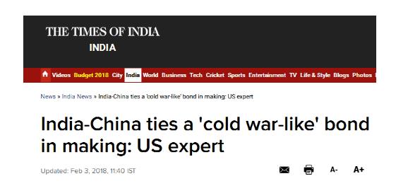 她评价中国和印度这是一种冷战式的关系,“印度和中国之间有着很强的商业往来,但与美国一样,印度也越来越不满与中国的贸易关系。“艾尔斯认为,在一段时间内,中印两国间的商业关系已经把他们的战略竞争降到了次要地位。