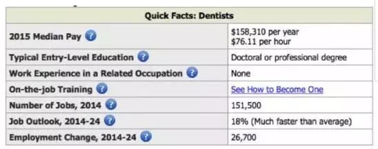 想要成为一位独立坐诊的牙医,从本科算起至少要经历10年的学习(还不是专科牙医),而我的牙医告诉我几乎每个牙学院毕业的学生都会背15-30万美金(100-210万元)的债务(土豪除外),因为学费实在太贵。但这些付出还是值得的,毕竟美国的学费贷款几乎就和白借钱给你一样,以后一两年的工资也就赚回来了。