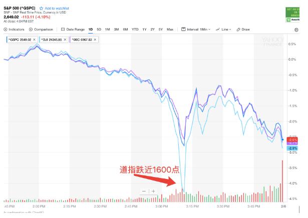 道指盘中一度跌近1600点,创下史上最大盘中点数跌幅。标普创2011年8月份以来最大单日跌幅,收跌4.1%。恐慌指数VIX一度大涨超100%。10年期美债收益率跌5个基点,脱离四年高位。