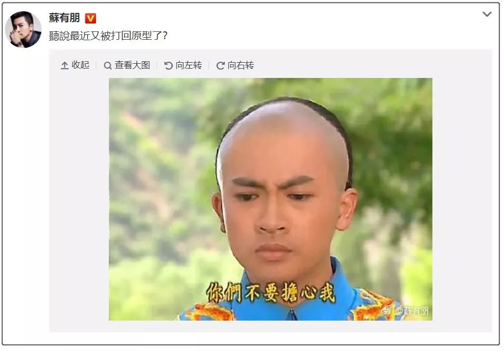 2月4日,“五阿哥”苏有朋在听闻还珠重播的消息后,特地发了一条微博:“听说最近又被打回原型了?”,配图还是自己的表情包,哈哈!