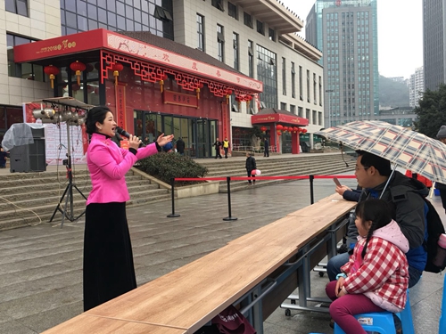 华龙网2月11日19时01分讯(记者戴文彬)11日,重庆下起蒙蒙细雨,室外略显寒冷。在渝北区图书馆,两场暖心的演出吸引了众多市民冒雨观看。当日,由中共重庆市委宣传部、重庆市文化委员会主办,渝北区委宣传部、区文化委承办的“奉献人民 放歌巴渝——城乡文化互动工程暨2018年春季送演出进基层活动”走进渝北区图书馆,重庆市歌剧院众多艺术家为广大渝北区市民奉献了两场精彩的文艺演出。