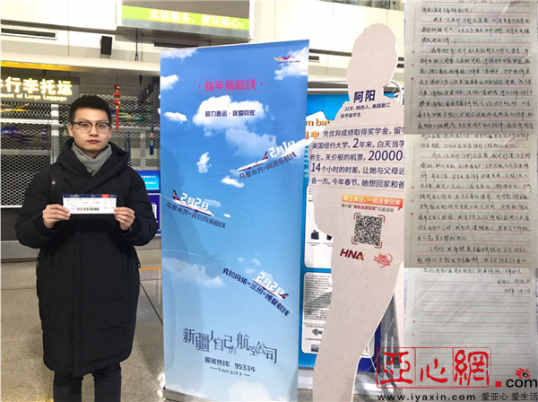 2018年2月9日,来自浙江湖州的大学生西部计划志愿者郑修斌,拿着乌鲁木齐航空第六届“送爱回家”捐助的免票机票,搭乘飞机第一次从新疆出发,踏上春运回家之路。